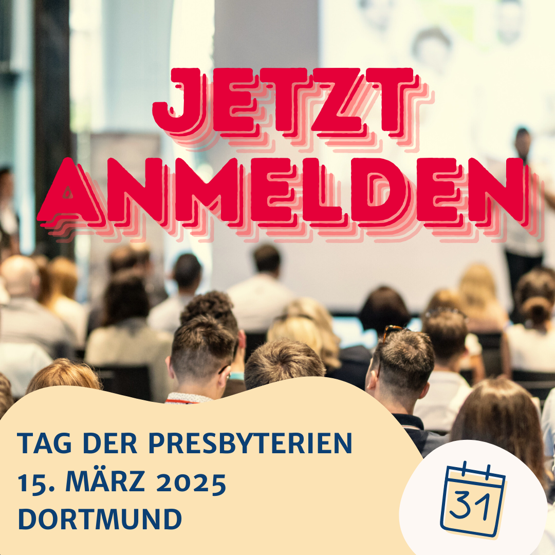 Endlich ist es soweit: Für alle Menschen in Gemeindeleitung in der Ev. Kirche von Westfalen ist die Anmeldung zum Tag der Presbyterien am 15. März 2025 in Dortmund online. Hier können Sie sich über das Programm, das hier und da noch leichte Veränderungen erfahren kann, informieren und sich anmelden.